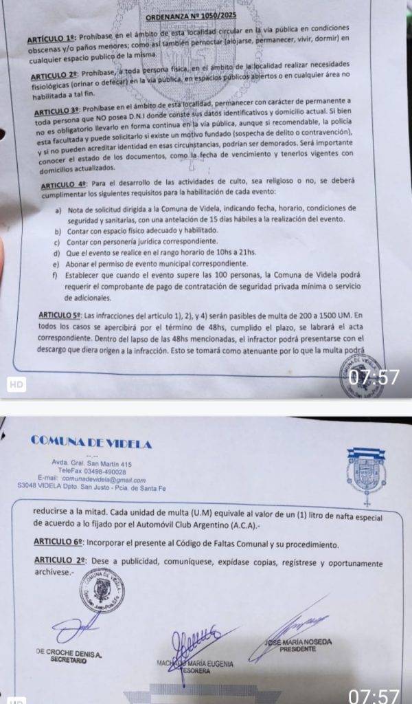 VIDELA NUEVA ORDENANZA DE CONVIVENCIA SOCIAL LLEVA EL NUMERO 1050/25.