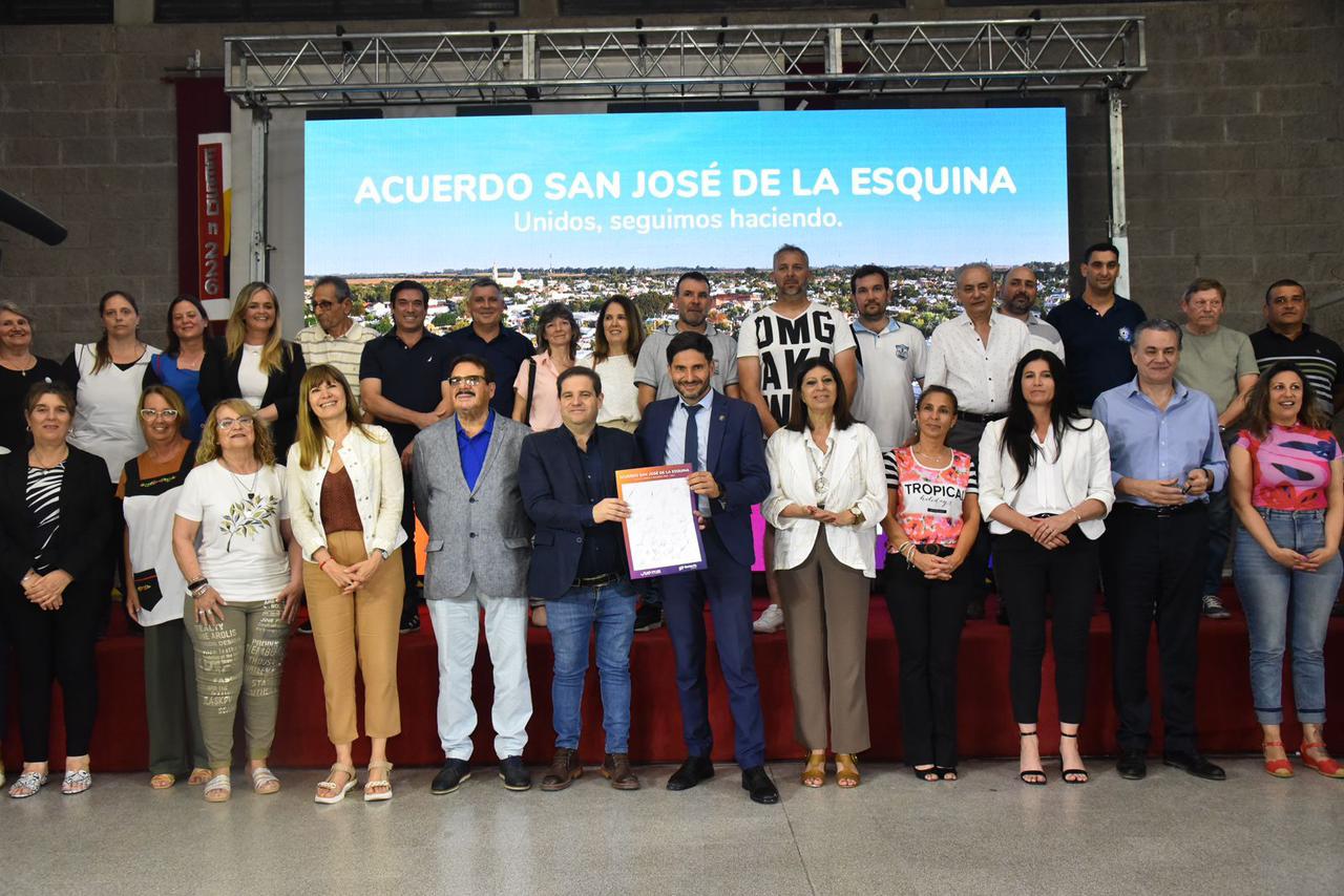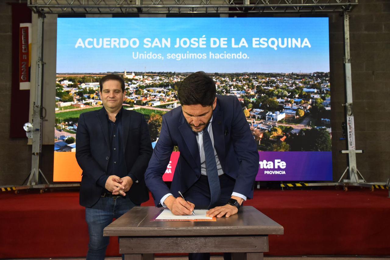 El gobernador Maximiliano Pullaro estuvo el viernes por la tarde en San José de la Esquina, donde firmó junto al presidente comunal Ezequiel Ruani un acuerdo por una serie de obras para la localidad que fue recientemente declarada ciudad y el año próximo elegirá intendente y concejales.