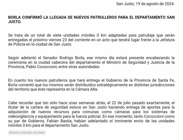 El Senador Rodrigo Borla confirmó que llegarán siete nuevos móviles policiales a San Justo el Próximo 23 de Agosto.
